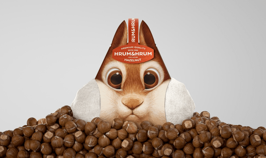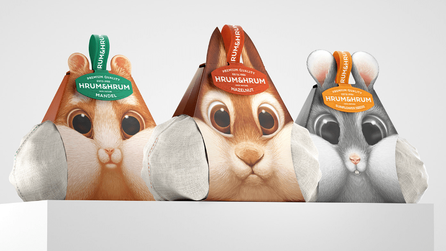 來(lái)自俄羅斯的Hrum-Hrum堅果,則 將堅果裝在布袋內,變成了小松鼠的“腮幫子”。