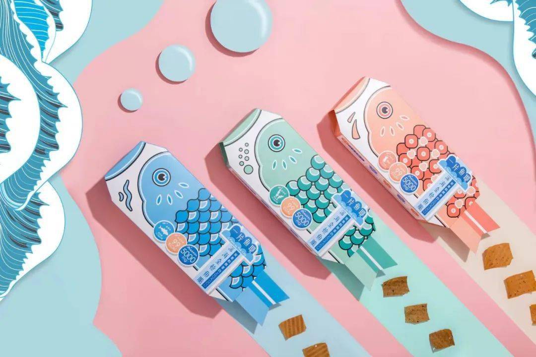 創(chuàng )新食品品牌“食驗室”,則 結合其招牌產(chǎn)品“魚(yú)脆”本身的特點(diǎn),選擇了“魚(yú)”作為萌寵符號,將整個(gè)產(chǎn)品包裝設計成“魚(yú)盒”造型。