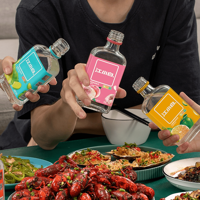 2020年上新的果立方水果味江小白,也正是采用了橙、黃、藍、粉四種甜味色彩塑造視覺(jué)沖擊力。十分符合江小白“年輕人的酒”的品牌形象。