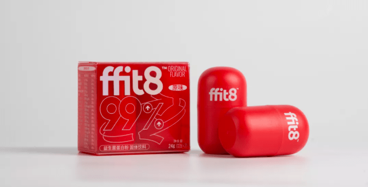 初創(chuàng )健康食品品牌ffit8,在2020年年底推出了一款“益生菌蛋白粉”新品,將傳統上由大罐形式售賣(mài)的蛋白粉產(chǎn)品,制作成創(chuàng )新的12克/顆的小罐形式,方面攜帶、食用。